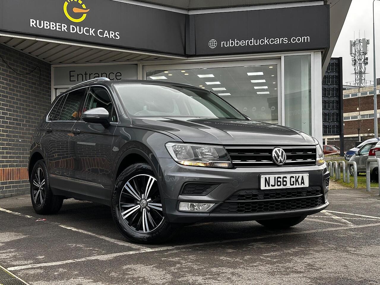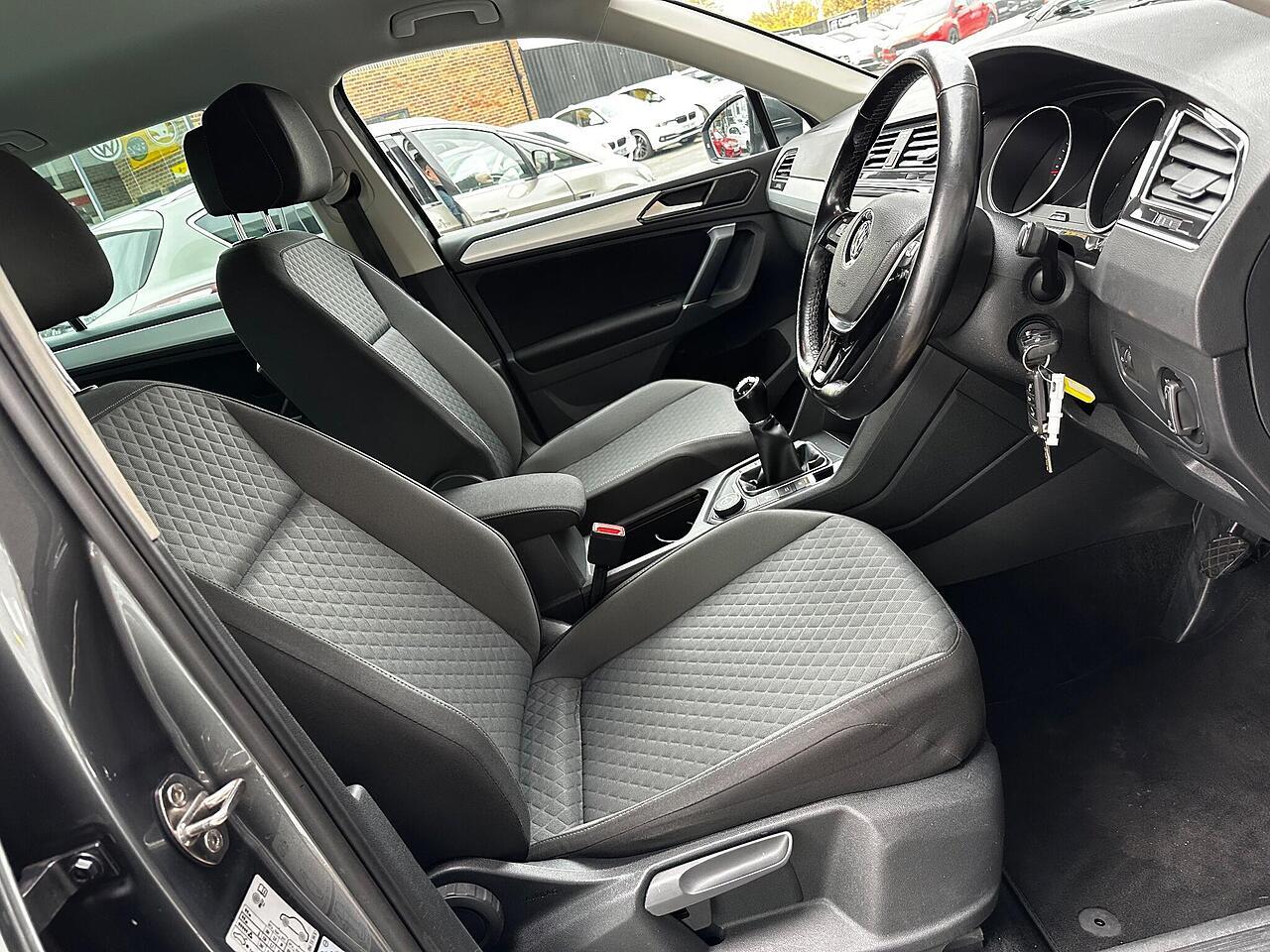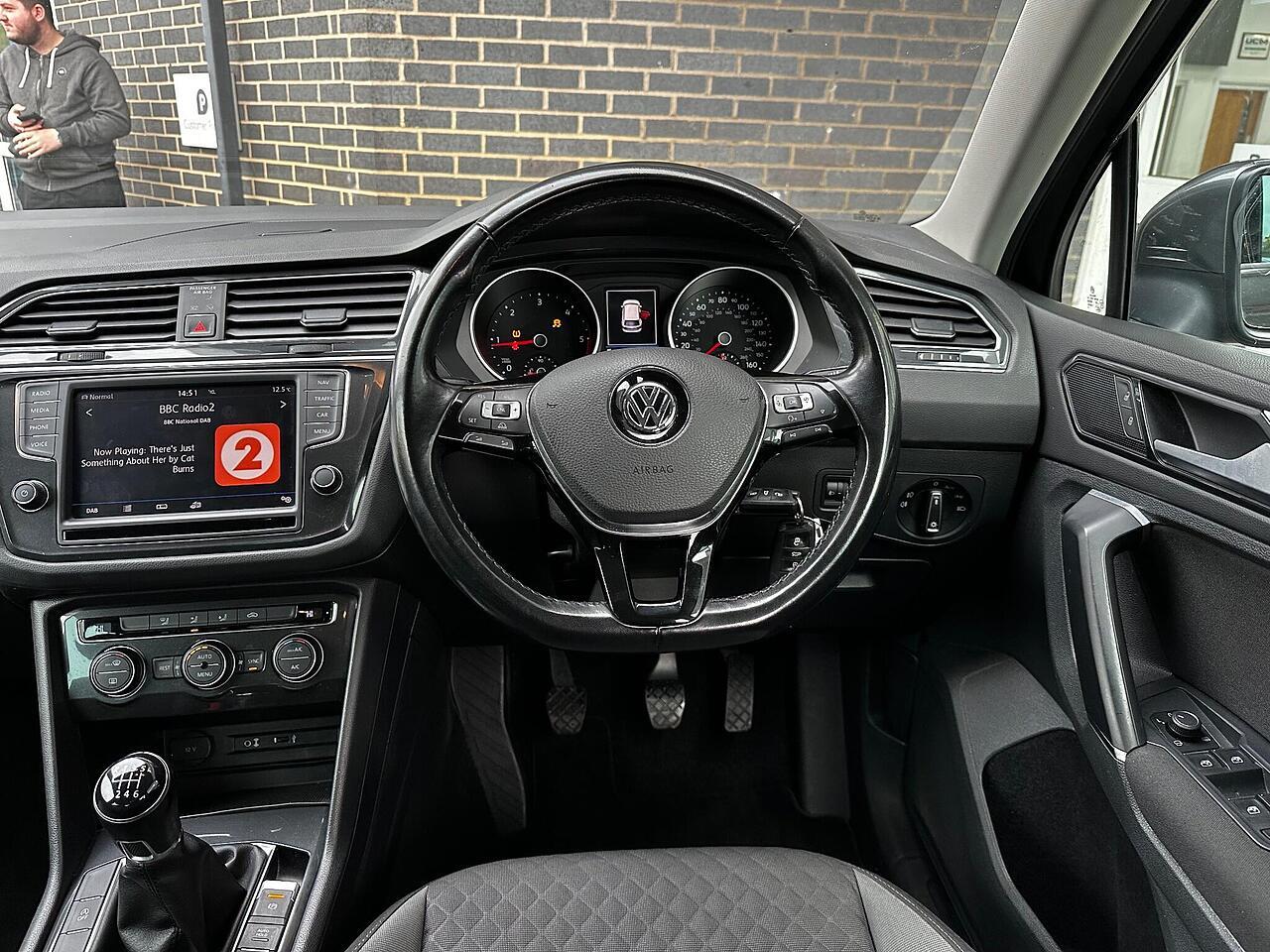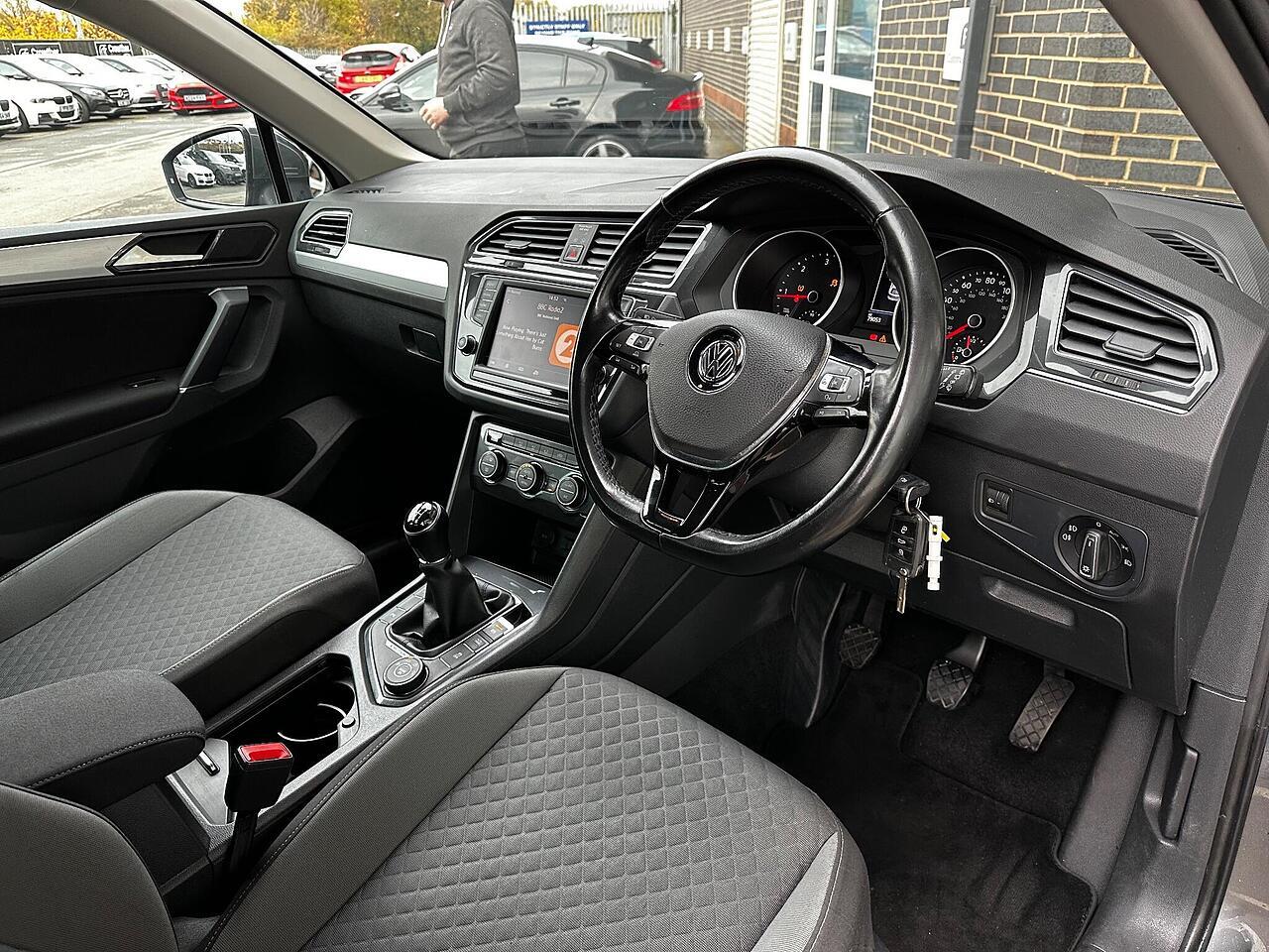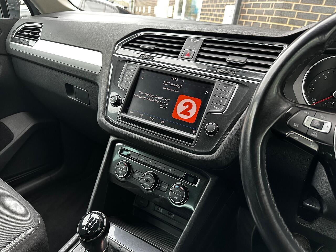 This 2016 Volkswagen Tiguan TDI SE Navigation is a superb example, having been owned by just one careful keeper from new. It boasts a robust 2.0 litre diesel engine paired with four wheel drive, ensuring capable performance in all conditions. As a Euro 6 compliant vehicle, it meets modern emissions standards. This SE Navigation trim level comes equipped with convenient features such as Bluetooth phone connectivity, automatic headlamp activation with separate daytime running lights and manual coming home function, and front and rear parking sensors to aid manoeuvrability. The climate control system ensures a comfortable cabin temperature for all occupants.
